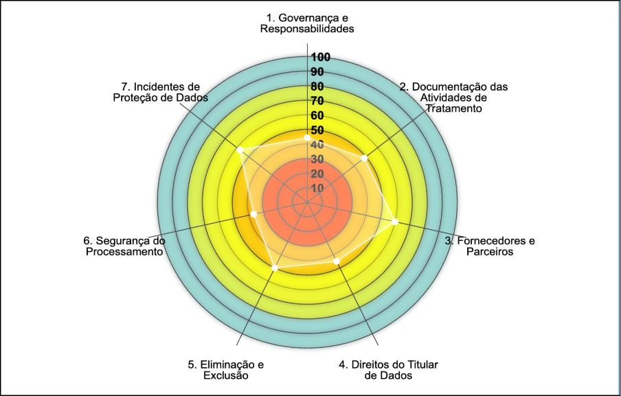 A partir do gráfico acima gerado pela ferramenta, Ecomply demonstra quais são os pontos que merecem maior atenção em seu projeto de adequação, te ajudando a eliminar lacunas e atingir resultados mais próximos do 100.