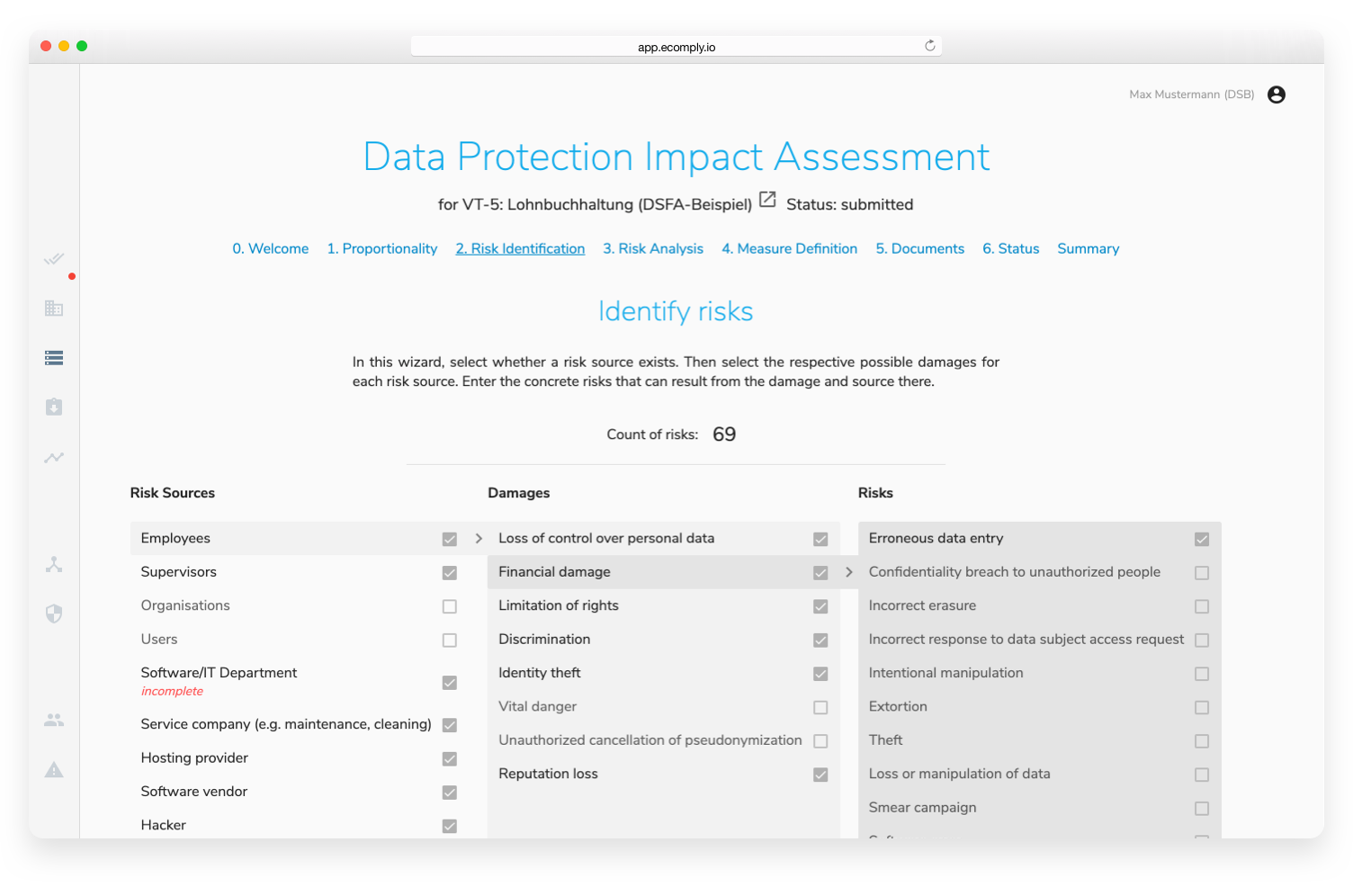 A DPIA is not an end in itself. It is mandated to identify risks. With ECOMPLY, all contributors work effectively and precisely to identify and quantify risks and measures. At all times, helpful advice and templates are provided.